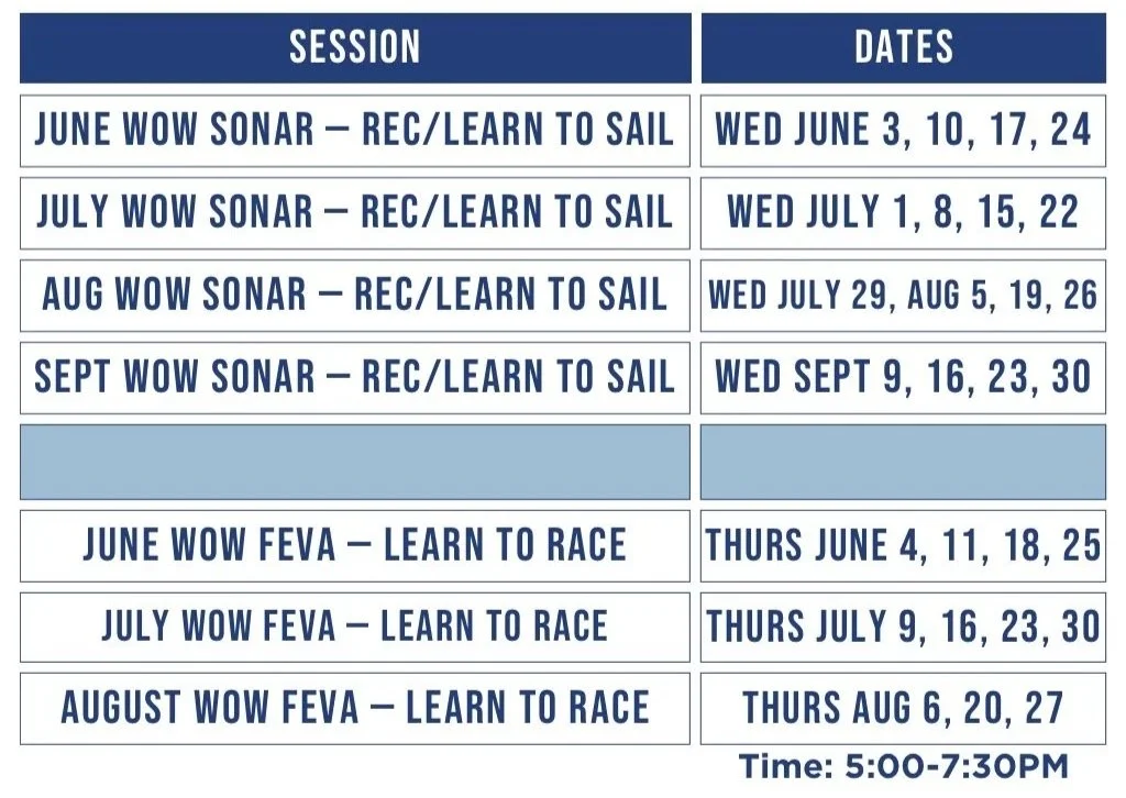 WEDNESDAY Sonar — Rec/Learn to Sail: Taught in 23′ Sonar Keelboats, 4 – 5 sailors per boat, along with an instructor. No experience required.