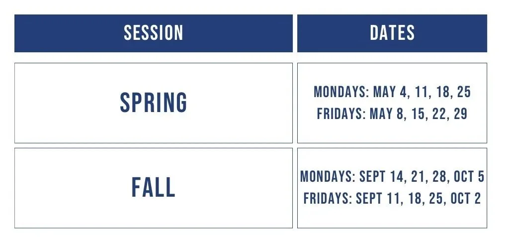 Spring: Mondays and/or Fridays in May from 4:30-7:00PM